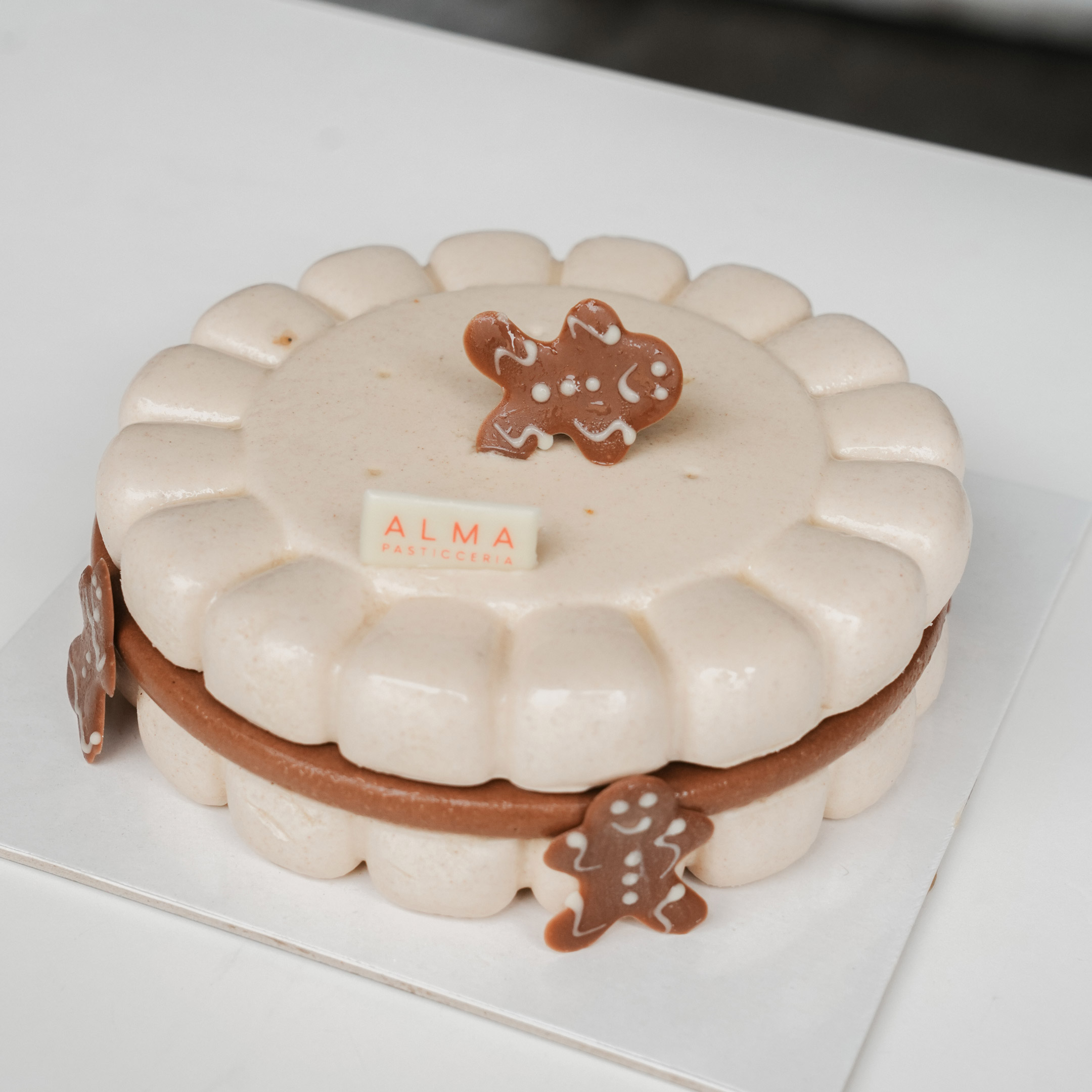 Mousse al pan di zenzero, con inserto al cioccolato fondente e biscotto pan di zenzero.